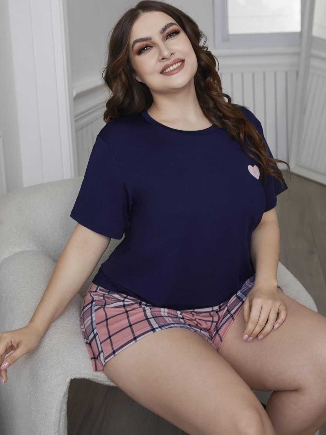 Plus Size Heart Graphic Top and Plaid Shorts Loungewear Set